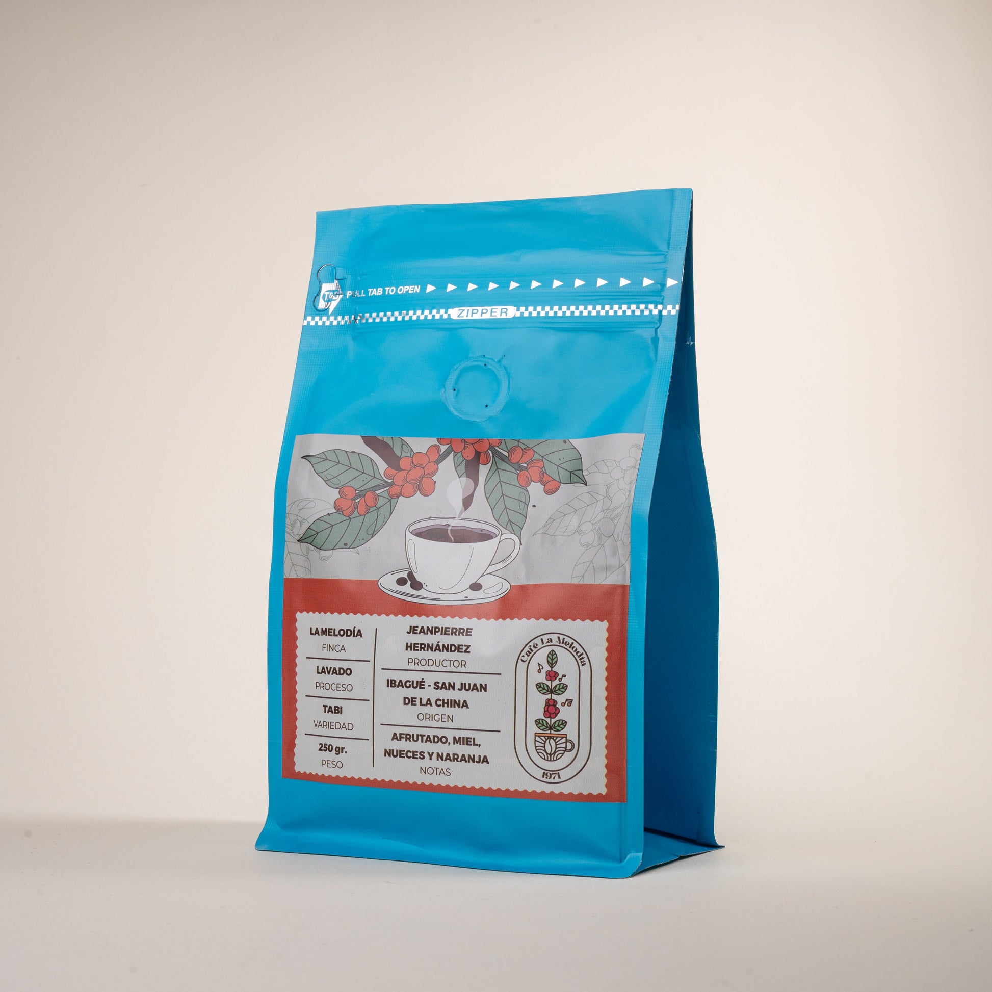 La Melodía es un café refinado y sofisticado, cultivado en las montañas de San Juan de la China, Ibagué, por el caficultor Jean Pierre Hernández. Con la variedad Tabi como protagonista y un proceso de lavado meticuloso, este café revela una experiencia sensorial pura y delicada, donde se destaca su equilibrio y frescura.